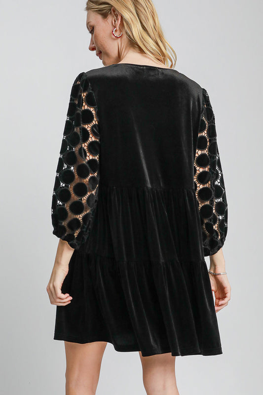 Umgee Dotted Lace Sleeve Tiered Velvet Mini Dress