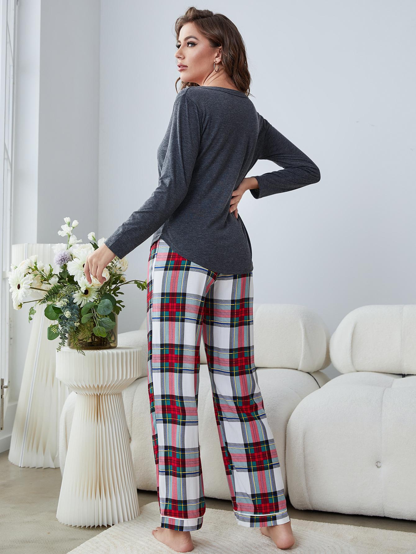 Buttoned Long Sleeve Top and Plaid Pants Lounge Set