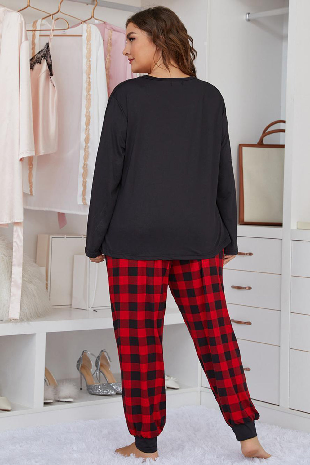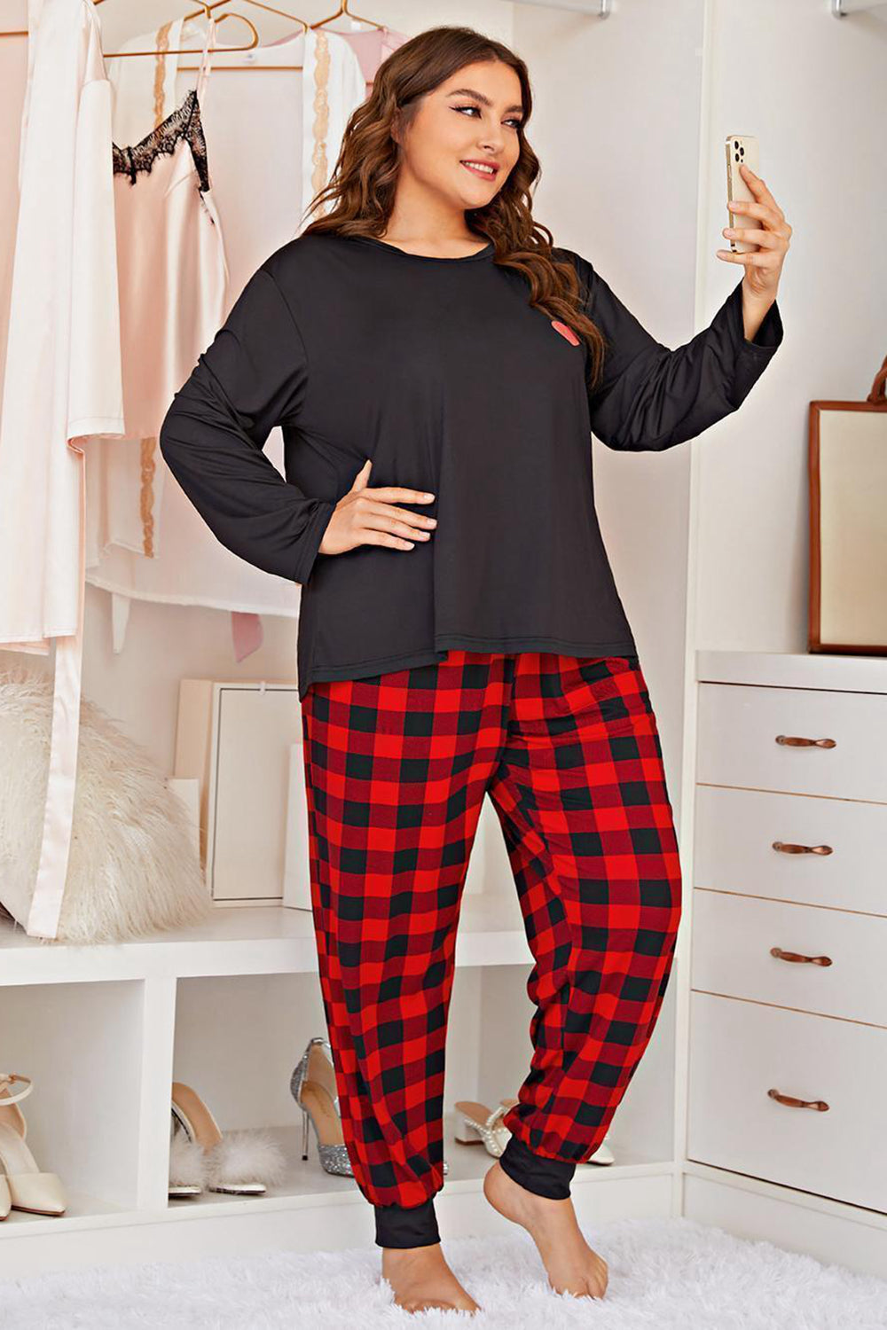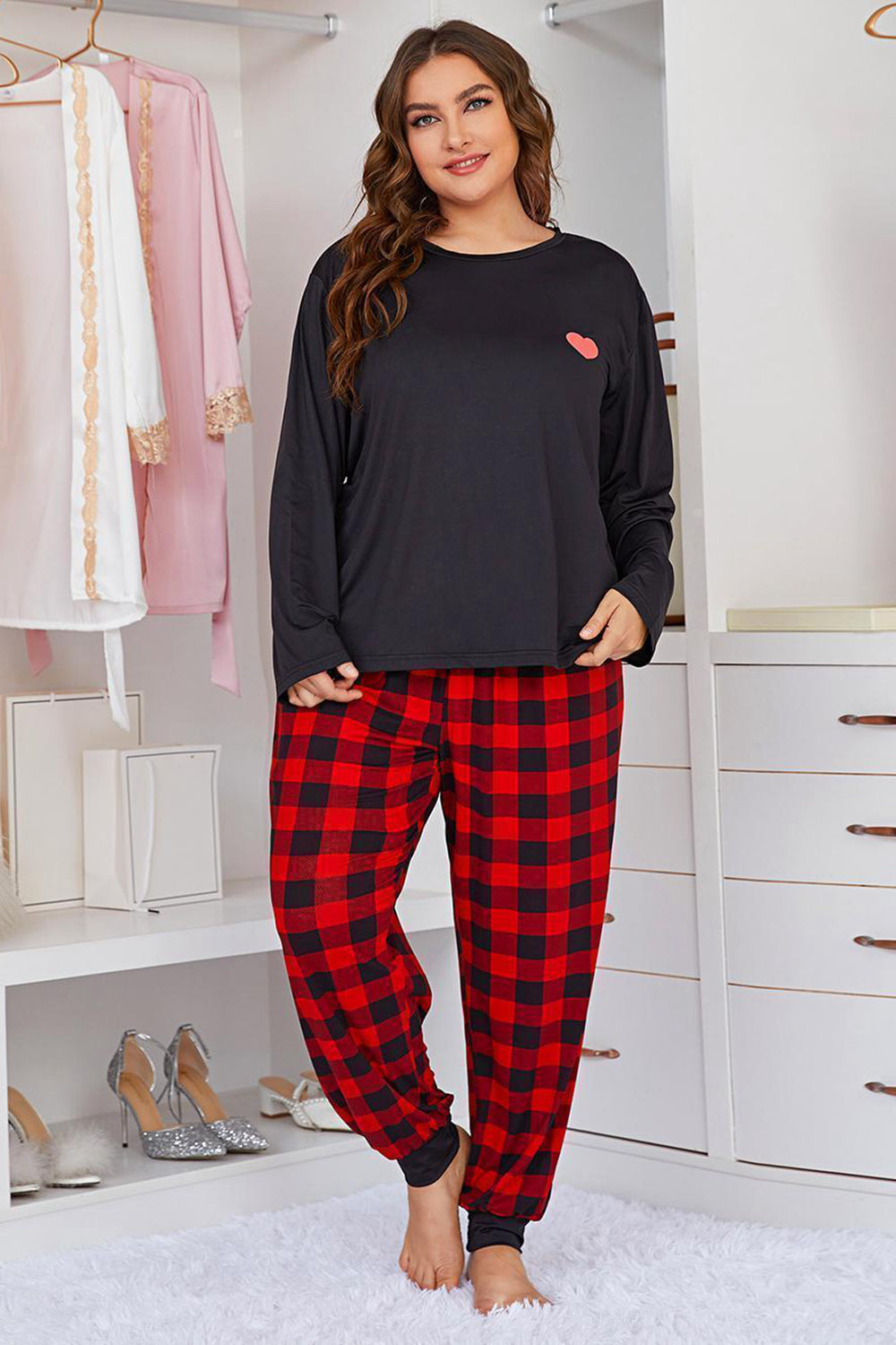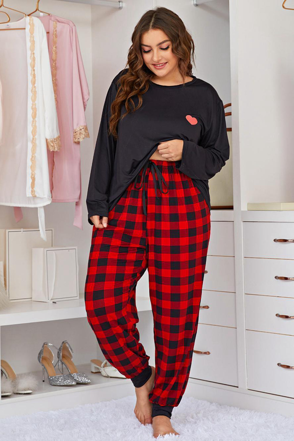 Plus Size Heart Graphic Top and Plaid Joggers Lounge Set