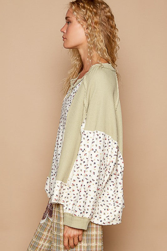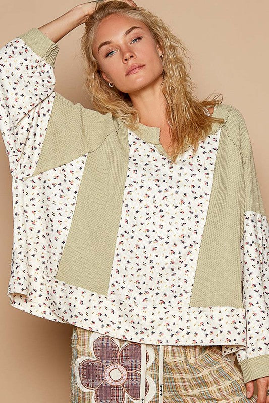 POL Waffle Knit Floral Notched Long Sleeve Top